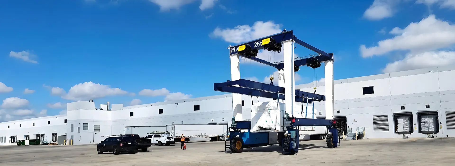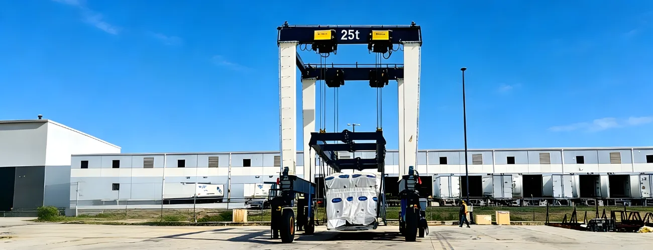 رافعة جسرية بإطارات مطاطية 25 طن لمناولة معدات أنظمة التدفئة والتهوية وتكييف الهواء